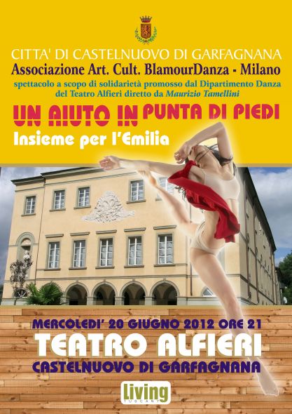 Una preziosa cornice ottocentesca, una direzione artistica prestigiosa, un’amministrazione comunale attenta, un’associazione artistico-culturale desiderosa di utilizzare la magia della Danza come mezzo per aiutare le popolazioni recentemente colpite dal terremoto in Emilia: questi gli ingredienti di “Un aiuto in punta di piedi”, la serata di solidarietà che mercoledì 20 Giugno 2012, alle ore 21:00, animerà il palco del Teatro Alfieri di Castelnuovo di Garfagnana.